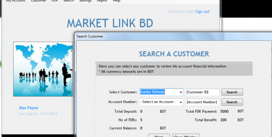 MLMBD Account Management System is a windows based application to manage client accounts. Administrator can manage fixed deposit amounts and other account management related activities through a secure admin module. Application is developed in Microsoft .Net platform.